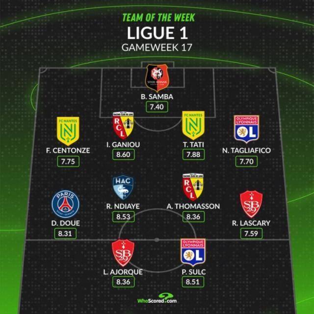 法甲第17轮联赛仍是完赛,whoscored也统计了本轮评分最好气势,南特、朗斯、布雷斯特、里昂各2将入围。whoscored法甲本轮最好阵: